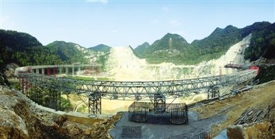 從貴陽機(jī)場驅(qū)車向南,經(jīng)高速公路轉(zhuǎn)上土石路,顛簸3個小時,穿過最后一道狹窄山口,500米直徑的白色鋼環(huán)突然出現(xiàn),填滿了視野。那是史上最大望遠(yuǎn)鏡的圈梁。