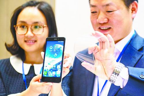 3月2日,中科院重慶綠色智能技術研究院的科技工作者在展示可彎折的石墨烯觸摸屏(右)和首批量產的石墨烯手機(左)。