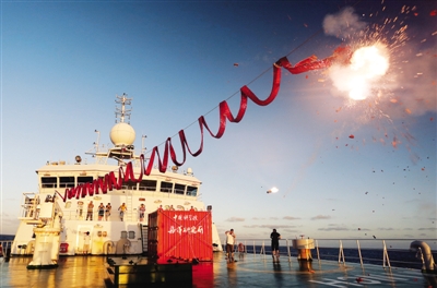 圖為船員在“科學(xué)”號(hào)前甲板放鞭炮慶祝元宵節(jié)和科考任務(wù)完成。新華社記者 孟菁攝
