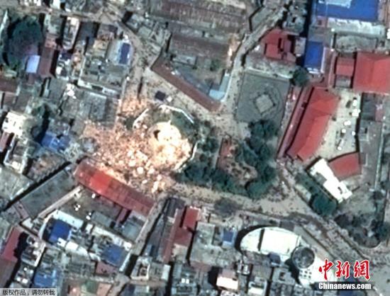 2015年4月25日,聯(lián)合國訓練研究所業(yè)務衛(wèi)星應用項目(UNITAR/UNOSAT)拍攝尼泊爾加德滿都Dharahara塔在地震中被毀的衛(wèi)星圖。圖為地震后。