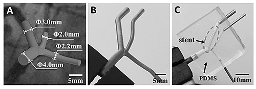?。ˋ)醫(yī)學(xué)圖像處理后的臨床病例(剛接受完血管支架手術(shù))血管數(shù)字模型;(B)使用高精度3D打印機制成的蠟基材質(zhì)的三維血管模型;(C)使用蠟基模型脫模制成的用于流體力學(xué)研究的血管通道模型(紅圈之內(nèi)是臨床使用的血管支架)。物理所供圖