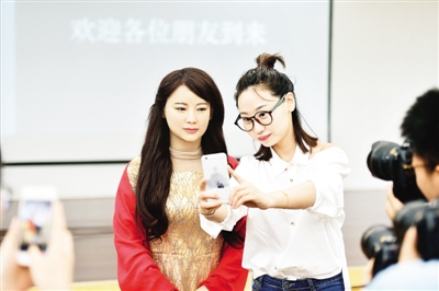 4月15日,在位于安徽合肥的中科大校園,機器人“佳佳”(左)在接受媒體記者拍照。新華社記者 劉軍喜攝