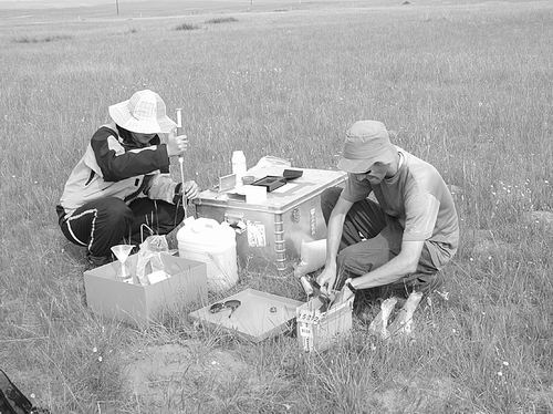 科研人員在草地樣方采集信息