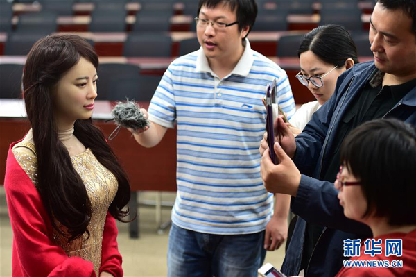 4月15日,在位于安徽合肥的中科大校園,機器人“佳佳”(左一)在接受媒體記者采訪拍照。當日,中國科學技術大學正式發(fā)布其研制的“特有體驗交互機器人”——“佳佳”?!凹鸭选背醪骄邆淙藱C對話理解、面部微表情、口型及軀體動作匹配、大范圍動態(tài)環(huán)境自主定位導航和云服務等功能。新華社記者 劉軍喜 攝