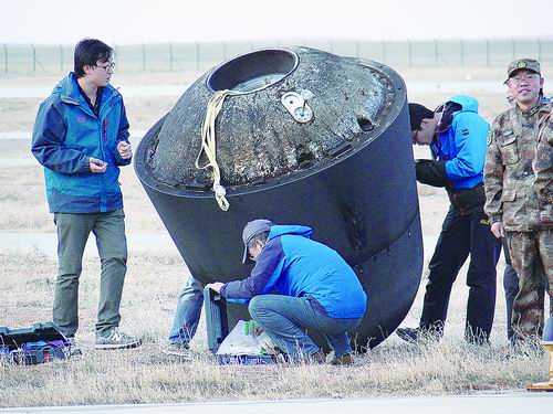 工作人員對(duì)實(shí)踐十號(hào)衛(wèi)星回收艙進(jìn)行現(xiàn)場(chǎng)處理。記者李瑜攝