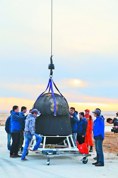 科研人員正在吊裝實(shí)踐十號(hào)衛(wèi)星回收艙。本報(bào)記者 徐暢攝