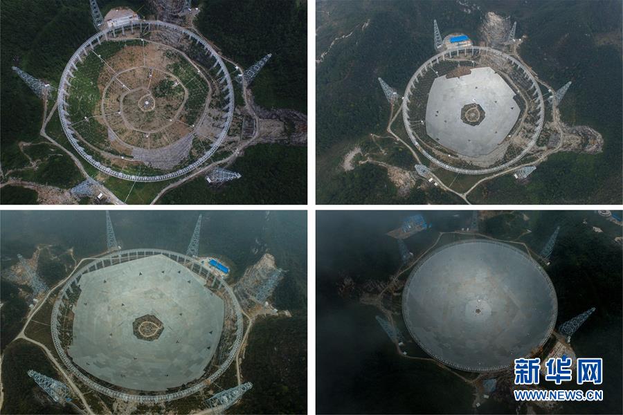 這張拼版照片為FAST項目拼裝第一塊反射面板(左上,2015年8月2日攝)、FAST反射面板安裝近半(右上,2015年12月16日攝)、FAST項目反射面板安裝近八成(左下,2016年3月9日攝)、FAST項目反射面板安裝完成(右下,2016年7月3日攝)。新華社記者歐東衢攝