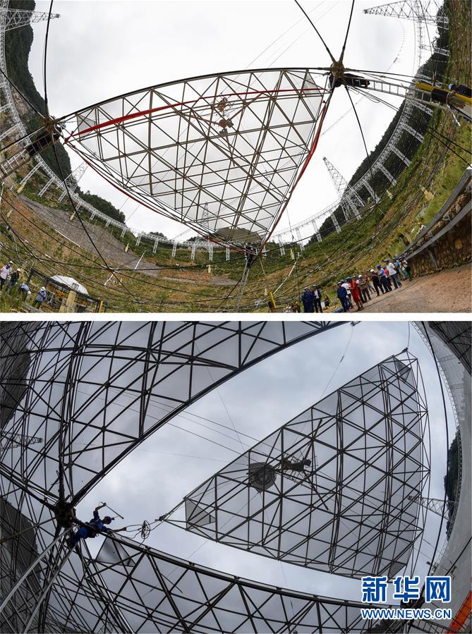拼版照片:上圖為2014年8月21日從FAST饋源艙處拍攝的天空(國家天文臺FAST項目團隊提供);下圖為2016年6月28日從FAST饋源艙處拍攝的天空(新華社記者歐東衢攝)。新華社發(fā)