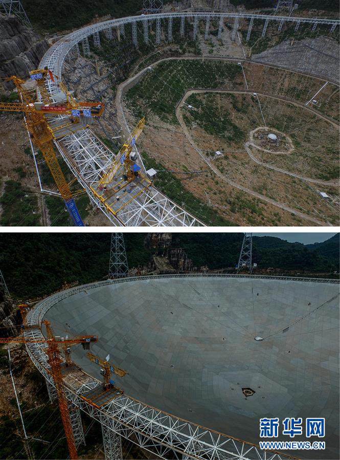 拼版照片:上圖為2015年8月2日拍攝的FAST首塊反射面板安裝成功;下圖為2016年7月2日拍攝的FAST一景。新華社記者歐東衢攝