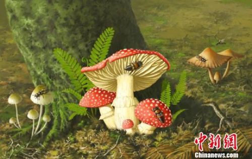 白堊紀中期巨須隱翅蟲取食蘑菇的生態(tài)復原圖。黃迪穎 供圖