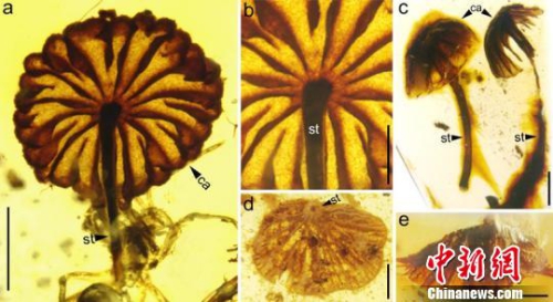 “目前已知的蘑菇化石均來自琥珀,共包含5種蘑菇化石,其中三例來自中新世多米尼加琥珀(約2000萬年前),兩例分別來自白堊紀新澤西琥珀(約9000萬年前)和緬甸琥珀。已知最古老的蘑菇來自白堊紀中期(約1億年前)的緬甸琥珀?!秉S迪穎稱,人們對蘑菇的早期演化歷史,特別是中生代演化史知之甚少。