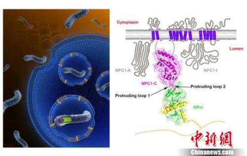 埃博拉病毒入侵宿主細(xì)胞模式圖(左)博拉病毒表面激活態(tài)糖蛋白GPcl與其宿主的內(nèi)吞體內(nèi)受體NPC1的復(fù)合物三維結(jié)構(gòu)圖(右)中國科協(xié) 供圖