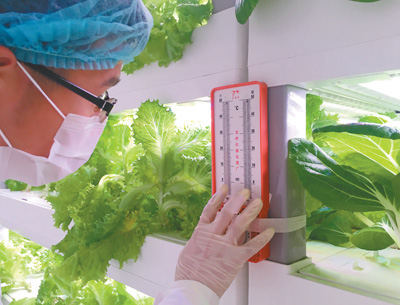 植物工廠的工作人員在生產(chǎn)車間內(nèi)調(diào)試溫度。 張素?cái)z