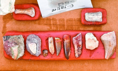 此次發(fā)現(xiàn)的恐龍和鱷類牙齒化石。新華社記者 許暢攝