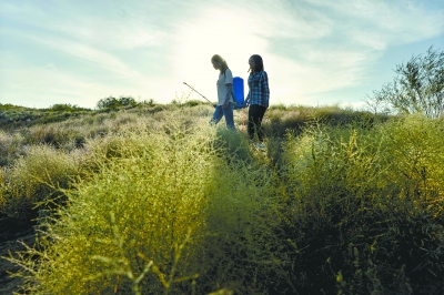 8日下午,頂著3時(shí)多的太陽(yáng),韓迎春和李琪背著40斤的水桶,走上20多分鐘,進(jìn)入到叢林深處的沙地,經(jīng)過(guò)近20年荒漠藻種植,基地周邊已形成高高低低的灌木叢林,要找上一片未被荒漠藻覆蓋的沙地,的確不容易。