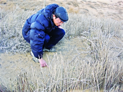 2008年12月,中科院武漢水生所專家劉永定實(shí)地觀察荒漠藻結(jié)皮效果。記者胡冬冬翻拍