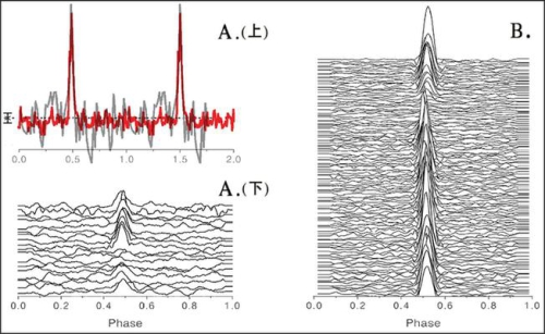 圖為新脈沖星的歸一化平均脈沖輪廓和單脈沖。A(上)為FP1平均脈沖輪廓,F(xiàn)AST通過約52.4秒漂移掃描(紅色)產(chǎn)生信噪比為Parkes望遠(yuǎn)鏡L波段積分2100秒結(jié)果(灰色)信噪比的3倍,表現(xiàn)出FAST高靈敏度優(yōu)勢。A(下)為FP1單脈沖輪廓。B為FAST采用跟蹤觀測5分鐘,獲得的另一顆新脈沖星FP2的單脈沖輪廓。