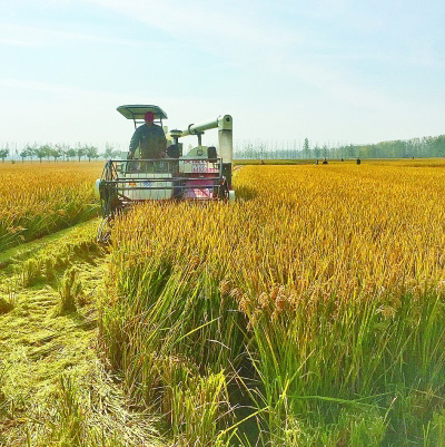 江蘇省沭陽縣青伊湖農(nóng)場正在收割運(yùn)用“分子模塊設(shè)計”技術(shù)育成的水稻新品種嘉優(yōu)中科1號。記者齊芳攝/光明圖片