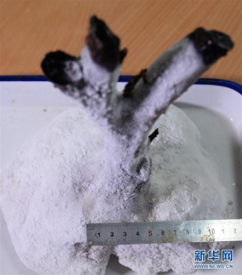 這是“發(fā)現”號遙控無人潛水器在西太平洋卡羅琳海山采集的巨大珊瑚的根部,專家推測其年齡超過萬年(9月4日攝)。新華社記者 張旭東 攝