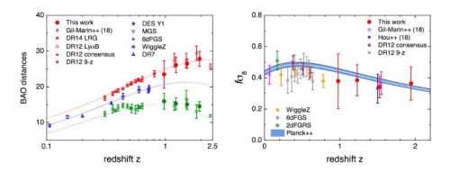eBOSS合作組通過(guò)觀測(cè)類星體獲得的宇宙膨脹(左圖)以及結(jié)構(gòu)形成歷史重建結(jié)果(右圖)。圖中含誤差棒的紅?實(shí)?圓圈為本次發(fā)布的結(jié)果,其余測(cè)量來(lái)?其他星系巡天觀測(cè)結(jié)果。圖中曲線是利?Planck 衛(wèi)星觀測(cè)宇宙早期微波背景輻射, 并假設(shè)標(biāo)準(zhǔn)宇宙學(xué)模型得到的擬合結(jié)果。(圖?來(lái)源:Zhao et al., 2018,https://arxiv.org/pdf/1801.03043.pdf)。
