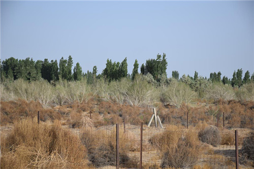 4月24日,中國科學(xué)院新疆生態(tài)與地理研究所策勒沙漠研究站實驗地不遠處就是一片綠洲。新華社記者白佳麗攝