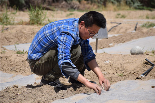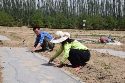 4月24日,中國科學(xué)院新疆生態(tài)與地理研究所學(xué)生李言言、曹登超正在實驗地中工作。新華社記者白佳麗攝