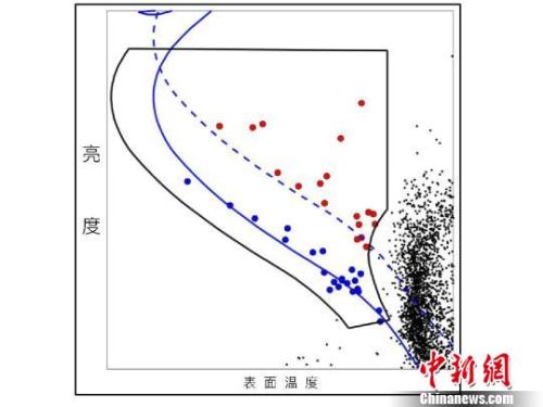 “NGC 2173”星團(tuán)藍(lán)離散星的亮度-表面溫度的二維分布。每一個(gè)點(diǎn)代表一顆恒星或雙星,黑點(diǎn)是“NGC 2173”的普通恒星。藍(lán)色和紅色圓點(diǎn)標(biāo)出了兩條恒星帶上的藍(lán)離散星。藍(lán)色實(shí)線和虛線是理論模型預(yù)測(cè)的兩支藍(lán)離散星的位置。中科院國(guó)家天文臺(tái) 供圖