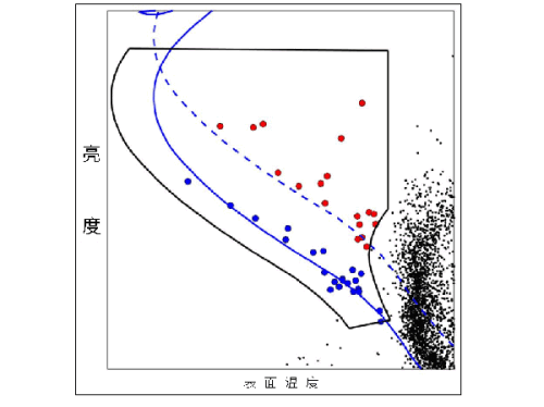 天文學(xué)家通過研究恒星的亮度和表面溫度來確定他們的形成年齡。將藍(lán)離散星畫在這樣一副亮度和表面溫度的二維圖上,隨機(jī)形成的藍(lán)離散星不具有任何典型的分布,它們僅僅隨機(jī)地分布在某個(gè)特定的區(qū)域內(nèi)。