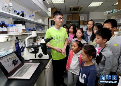 5月12日,在中科院生物化學與細胞生物學研究所的實驗室,科研人員在向青少年介紹細胞的基本知識。新華社記者 劉穎 攝