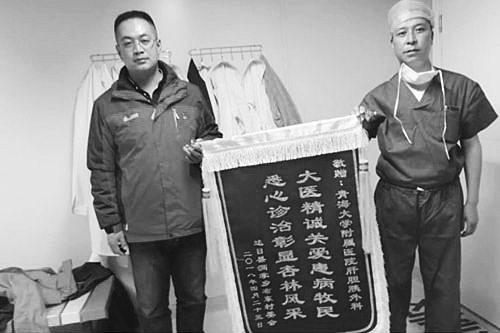 扶貧工作隊員為青海大學(xué)附屬醫(yī)院肝膽胰外科獻上錦旗。