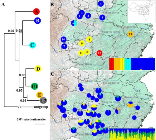 圖為 基于線粒體片段、簡化基因組SNP、微衛(wèi)星數(shù)據(jù),中國大鯢系統(tǒng)發(fā)育關系和遺傳結構。其中圖A. 基于線粒體基因片段,構建的野生種群(A-E)及4個養(yǎng)殖個體(UI, U2)構建的系統(tǒng)發(fā)育關系。圖B. 野生種群的分布點;餅圖顏色對應圖A中線粒體支系;右下角為基于簡化基因組SNP數(shù)據(jù)的群體結構(最適K=5),顏色對應線粒體支系。圖C. 養(yǎng)殖種群的樣品采集點;餅圖顏色對應A中線粒體支系;右下角為基于微衛(wèi)星數(shù)據(jù)的群體結構(最適K=1. 這里顯示第二最適K=3)。中科院供圖