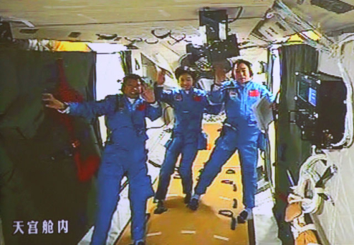 北京航天飛控中心大屏幕顯示航天員景海鵬、劉洋、劉旺(從右至左)在天宮一號實(shí)驗(yàn)艙內(nèi)(2012年6月18日攝)。