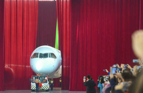 我國自主研制的C919大型客機(jī)首架機(jī),在中國商飛公司總裝制造中心浦東基地廠房內(nèi)正式下線(2015年11月2日攝)。新華社發(fā)(裴鑫 攝)