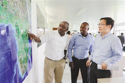 中國科學(xué)院中非聯(lián)合研究中心的中肯兩國專家在分析遙感衛(wèi)星地圖。記者呂強攝