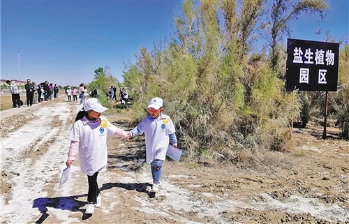 孩子們?cè)谛陆房祷哪鷳B(tài)系統(tǒng)國(guó)家野外科學(xué)觀測(cè)研究站鹽生植物園區(qū)參觀。