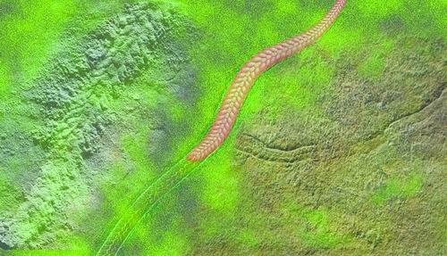 2013年,中科院南京地質(zhì)古生物所研究員陳哲、周傳明、袁訓(xùn)來和弗吉尼亞理工大學(xué)教授肖書海,在中國三峽地區(qū)大約5.5億年前的地層中發(fā)現(xiàn)了一類特殊保存的新的動(dòng)物化石?;佻F(xiàn)了一條行進(jìn)中蟲子的“最后時(shí)刻”——該動(dòng)物的遺體和它最后行進(jìn)的拖痕(印跡)同時(shí)保留在一塊巖石上。這一新的化石證據(jù)表明,在埃迪卡拉紀(jì)已出現(xiàn)了具有運(yùn)動(dòng)能力且身體分節(jié)的兩側(cè)對(duì)稱后生動(dòng)物。