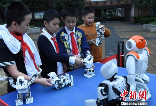圖為孩子們現(xiàn)場觀摩智能機(jī)器人。周毅 攝