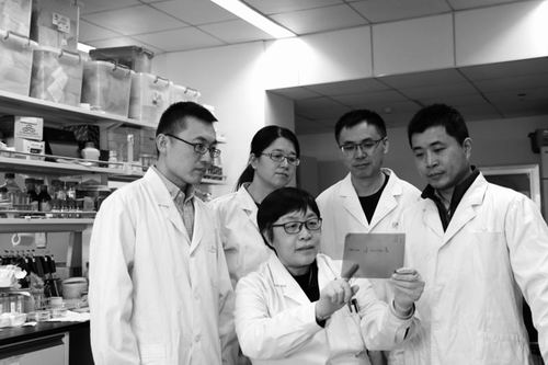 曹曉風(fēng)和獲獎(jiǎng)團(tuán)隊(duì)成員正在解析實(shí)驗(yàn)結(jié)果(前排為曹曉風(fēng),后排左起:劉斌、劉春艷、宋顯偉、陸發(fā)?。2軙燥L(fēng)供圖