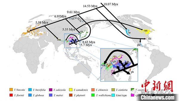 研究發(fā)現(xiàn),紅豆杉屬起源于早白堊紀,但現(xiàn)生類群在晚漸新世至早中新世在北美洲開始分化,之后通過白令陸橋到達亞洲,在中新世晚期又回遷到北美東部,形成洲際間斷分布格局;歐亞大陸的物種多樣化始于約8百萬年前的中新世晚期,在中新世晚期至上新世早期很短的時間窗口內(nèi)形成現(xiàn)存的多個物種,在橫斷山區(qū)(特別是四川盆地西部)和秦嶺山地發(fā)生雜交,并形成了3個譜系。
