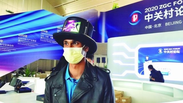 2020中關(guān)村論壇有大量的柔性屏技術(shù)展示,圖為柔性屏技術(shù)應(yīng)用案例——帽子上的柔性屏。柔性屏夾克外套、柔性屏禮帽、柔性駕駛艙人機(jī)交互系統(tǒng)等,充分體現(xiàn)了柔性屏技術(shù)廣泛的場景應(yīng)用。鄭金武攝