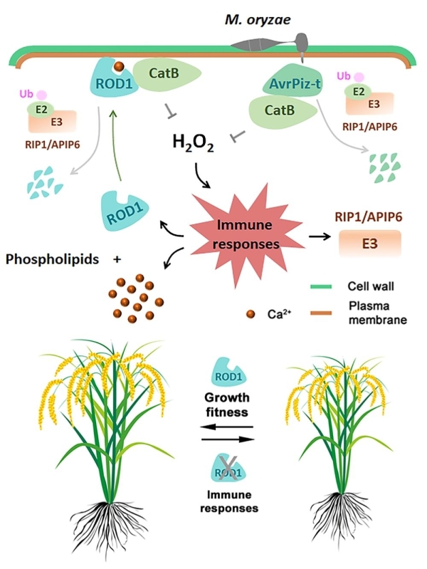 據(jù)何祖華研究員介紹,這一研究最新發(fā)現(xiàn)水稻的“鈣離子感應(yīng)子ROD1”,是一個(gè)新的植物免疫抑制中樞。當(dāng)沒有病原菌侵染時(shí),ROD1可將水稻的基礎(chǔ)免疫維持在較低水平,以有利于水稻生長(zhǎng),提高產(chǎn)量。但當(dāng)遭遇病原菌侵染時(shí),水稻就進(jìn)化出免疫激發(fā)新途徑:通過降解ROD1,減弱其功能,從而保證植物在抵御病原菌時(shí),產(chǎn)生有效的防衛(wèi)反應(yīng),不至于迅速發(fā)病枯死,并能繁殖后代。