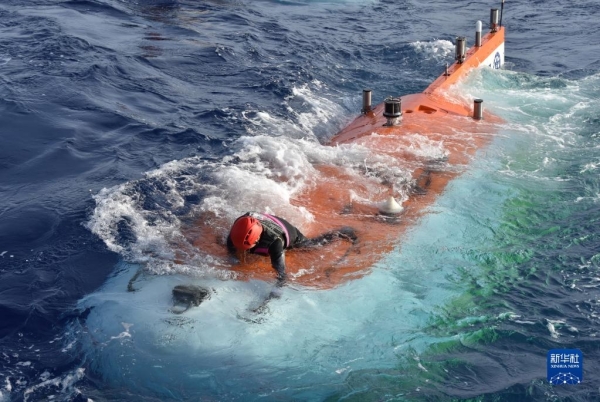 “奮斗者”號在西太平洋入水后,“蛙人”解開拖拽纜(9月9日攝)。新華社記者 陳凱姿攝