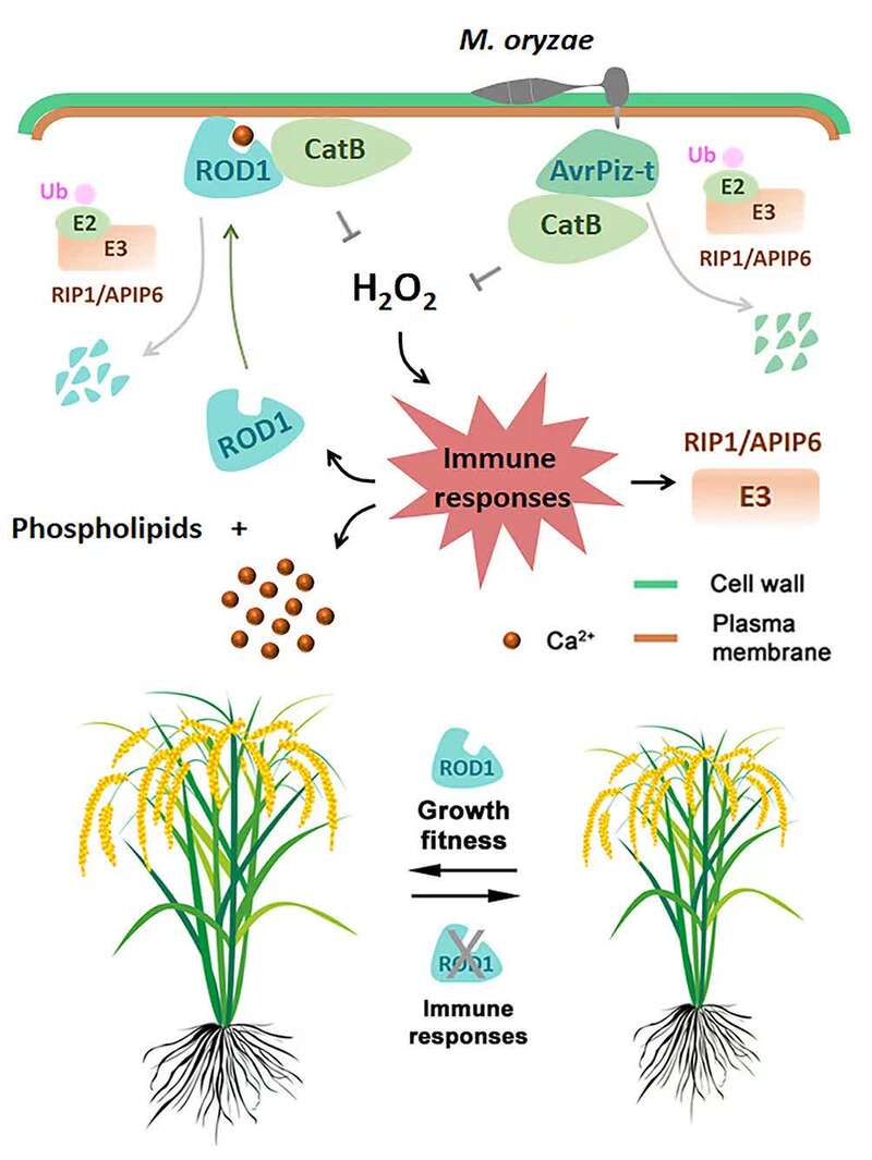 水稻是我國最重要的糧食作物之一,但近年來,我國水稻病蟲害發(fā)生情況嚴(yán)重,病蟲害種類多,發(fā)生范圍廣,呈現(xiàn)多發(fā)、頻發(fā)、老病新發(fā)態(tài)勢,對我國農(nóng)業(yè)生產(chǎn)和糧食安全構(gòu)成嚴(yán)重威脅。因此,為了有效控制水稻病害,保障我國糧食高產(chǎn)穩(wěn)產(chǎn),作物育種學(xué)家和病理學(xué)家長期致力于選育廣譜持久的水稻抗病品種,但高抗的水稻品種往往生長發(fā)育受到限制,導(dǎo)致產(chǎn)量降低,即以犧牲生長發(fā)育為代價(jià)換取抗病性以實(shí)現(xiàn)最終的生存。那如何在水稻抗病的同時(shí)不影響其產(chǎn)量性狀,維持好植物抗病與生長發(fā)育的平衡?此外,面對病原菌的不斷進(jìn)化,如何讓植物的免疫屏障有效抵御不同病原菌的反復(fù)進(jìn)攻?