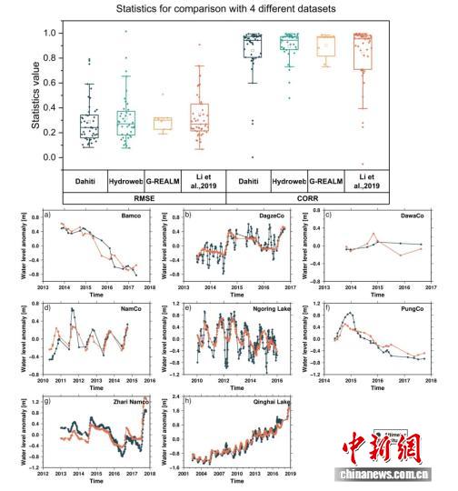 此次發(fā)布的361個(gè)青藏高原湖泊數(shù)據(jù)集之中,181個(gè)湖泊具有2002年—2021年連續(xù)20年的水位序列,另180個(gè)湖泊具有2010年—2021年水位序列。該數(shù)據(jù)集與實(shí)地測(cè)量值高度一致,8個(gè)驗(yàn)證點(diǎn)的中位數(shù)均方根誤差僅0.19米。同時(shí),與國(guó)際主流衛(wèi)星測(cè)高產(chǎn)品相比,相關(guān)誤差均低于0.30米,達(dá)到了國(guó)際先進(jìn)水平。