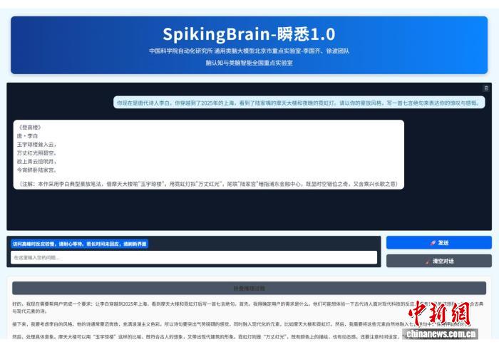 最新研發(fā)發(fā)布的類腦脈沖大模型“瞬悉”1.0界面。中國科學(xué)院自動(dòng)化研究所 供圖