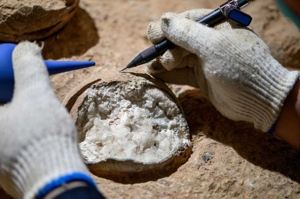 工作人員正在恐龍蛋化石上采集研究樣品。(湖北省地質(zhì)科學研究院供圖)