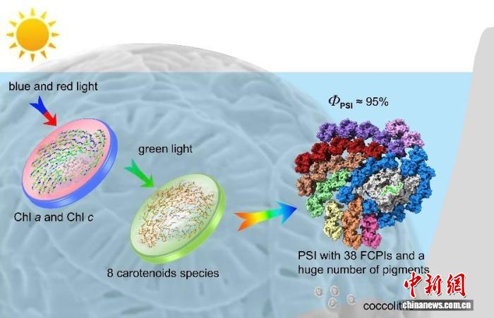 作為海洋中主要浮游植物之一,顆石藻能適應海水不同深度的多變光環(huán)境,高效的光合自養(yǎng)生長可助其快速繁殖,但顆石藻光系統(tǒng)復合物如何能高效捕獲和利用光能的微觀機理及進化機制,此前并不清楚,也備受關注。