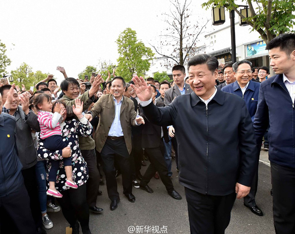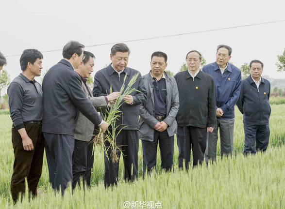 25日下午,習(xí)近平來(lái)到小崗村4300畝高標(biāo)準(zhǔn)農(nóng)田示范點(diǎn),沿著田埂走進(jìn)麥田,察看小麥長(zhǎng)勢(shì),向村干部、種糧大戶和農(nóng)技人員了解土地流轉(zhuǎn)、農(nóng)田整理、種植品種、畝產(chǎn)量、病蟲害防治、糧食收購(gòu)等情況。聽了大家介紹情況,總書記說(shuō),現(xiàn)在正值抽穗灌漿的關(guān)鍵時(shí)期,要加強(qiáng)田間管理,實(shí)現(xiàn)豐收,今年的白饃能吃到嘴里了。