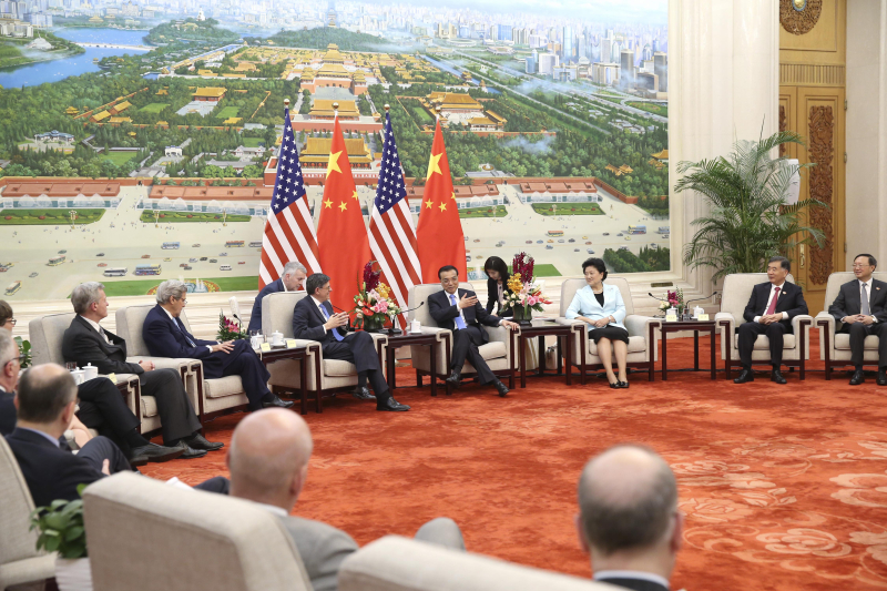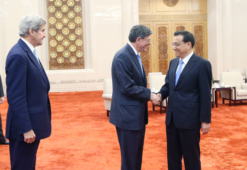 國(guó)務(wù)院總理李克強(qiáng)7日下午在人民大會(huì)堂會(huì)見來華出席第八輪中美戰(zhàn)略與經(jīng)濟(jì)對(duì)話、第七輪中美人文交流高層磋商的美國(guó)國(guó)務(wù)卿克里和財(cái)政部長(zhǎng)雅各布·盧。