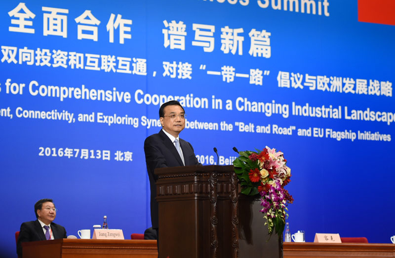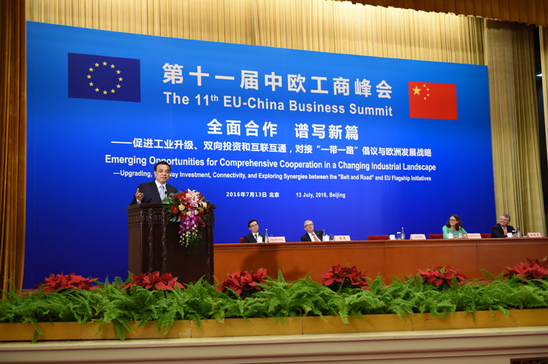 國(guó)務(wù)院總理李克強(qiáng)7月13日上午在人民大會(huì)堂與歐盟委員會(huì)主席容克共同出席第十一屆中歐工商峰會(huì)并發(fā)表演講。中歐雙方企業(yè)家600余人與會(huì)。